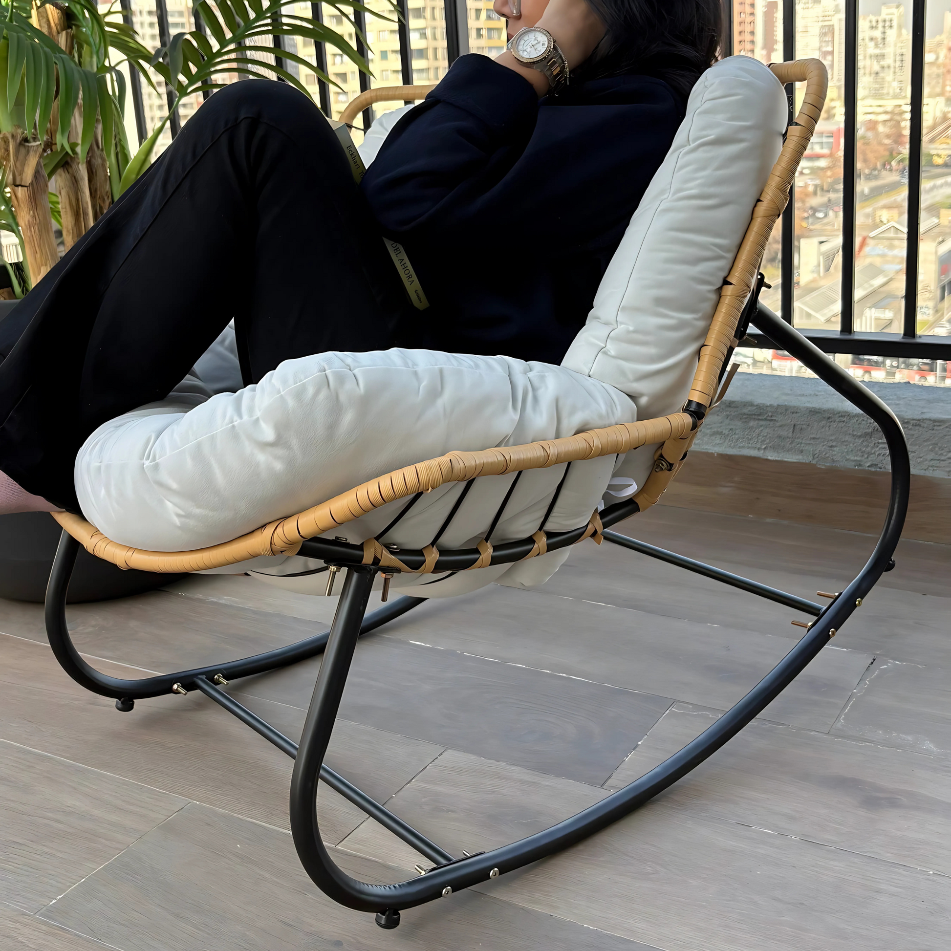 Diseñada para inspirar calma, la Silla Mecedora Boho Beige es el complemento perfecto para cualquier rincón de tu hogar.